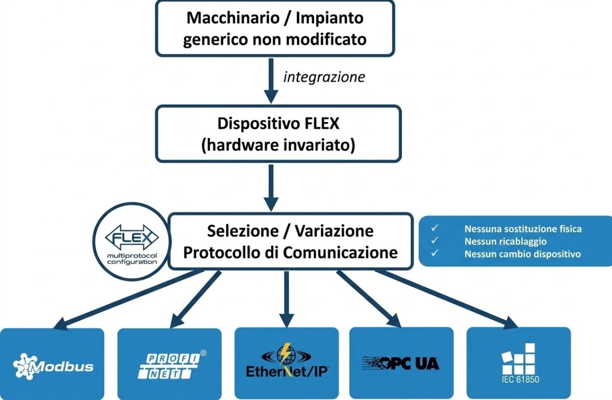 FLEX: selezione del protocollo di comunicazione senza modifiche hardware, ricablaggi o sostituzioni del dispositivo.