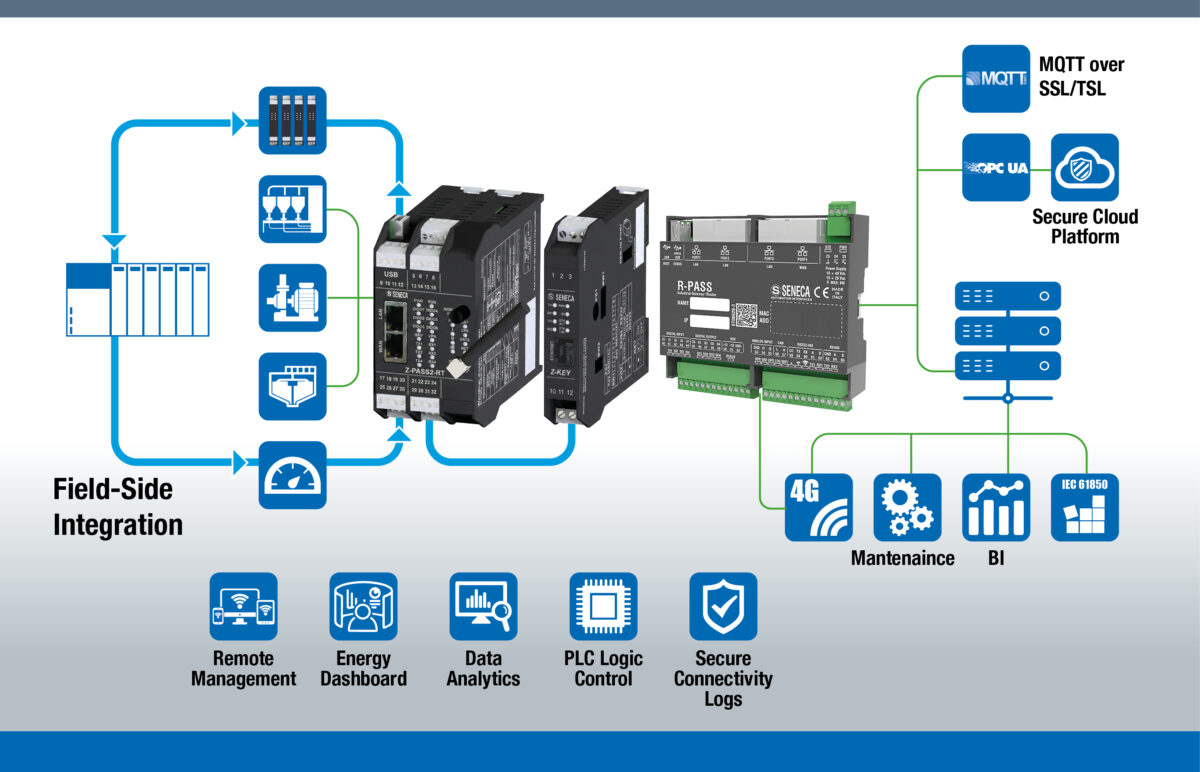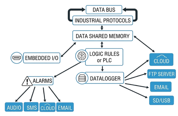 Il firmware integra in un’unica piattaforma funzioni di PLC, gateway, datalogging e connettività cloud. Nei dispositivi SENECA i dati provenienti da bus industriali, reti Ethernet o ingressi I/O confluiscono in una shared memory comune sulla quale operano simultaneamente logiche PLC, servizi multiprotocollo e funzioni IIoT. Controllo, acquisizione ed elaborazione lavorano quindi sullo stesso dato operativo.