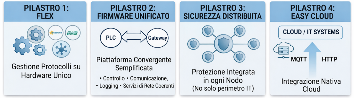 Il paradigma Adaptive Automation si basa su quattro elementi tecnologici integrati: FLEX, Firmware Unificato, Sicurezza Distribuita ed Easy Cloud.